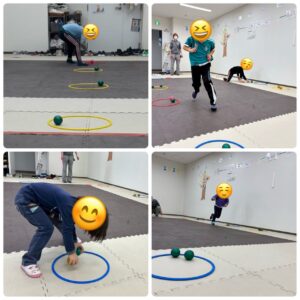 ミニフープの中に入ったボールをスタートした地点に置いてあるフープに持ってくるというゲームです